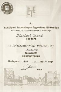 1994-ben Kalácsi René építészmérnöki diploma-díjban részesült.