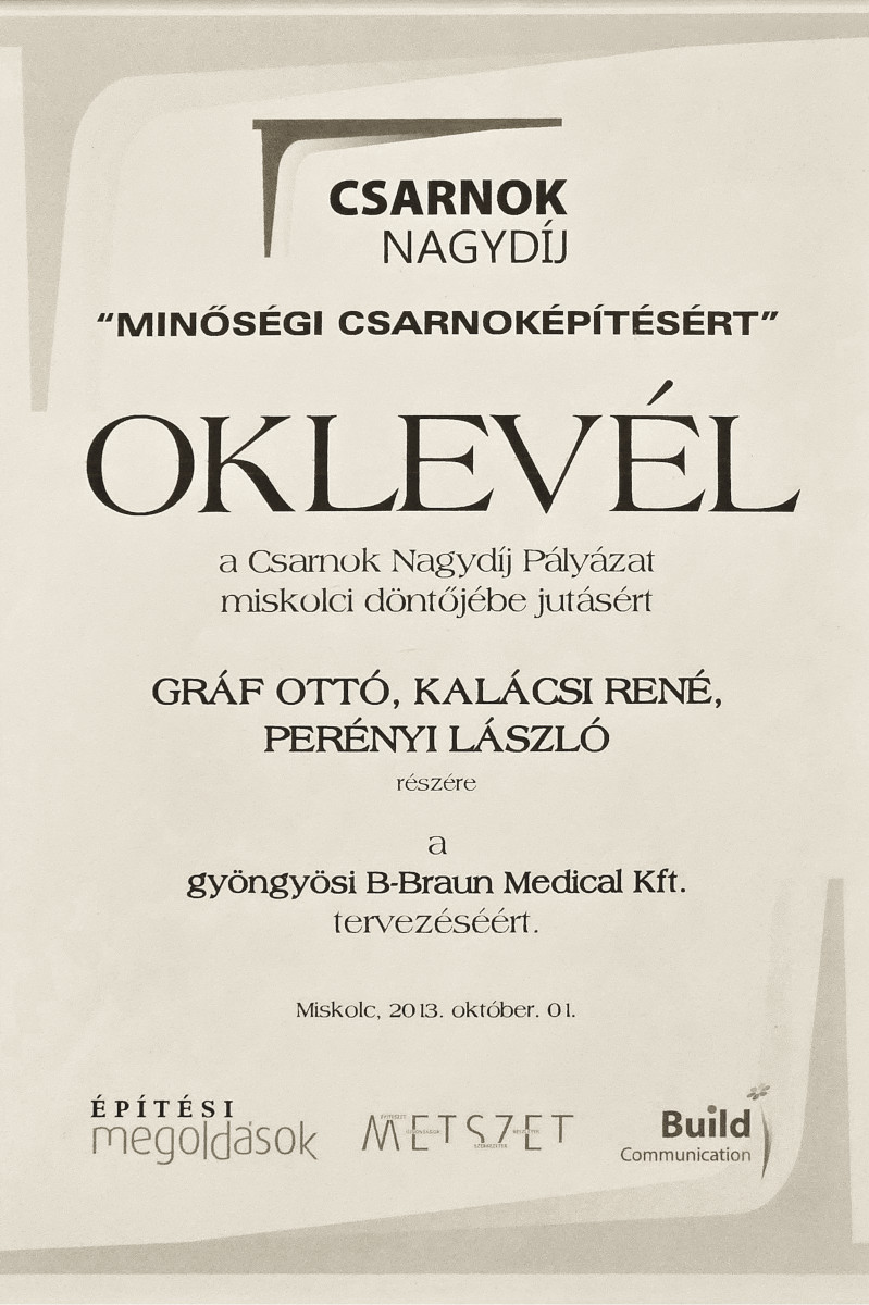 2013-ban a “Csarnok Nagydíj – Minőségi csarnoképítésért” pályázaton az észak-magyarországi régió szakmai díját kapta meg az építész tervező csapat.