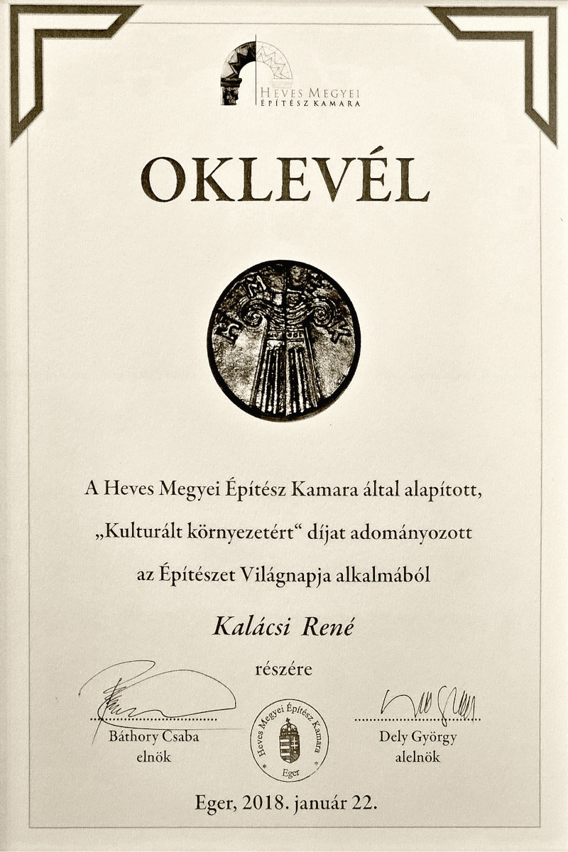 2018-ban a Heves Megyei Építész Kamara által alapított, „Kulturált környezetért” díjat adományozták Kalácsi Renének