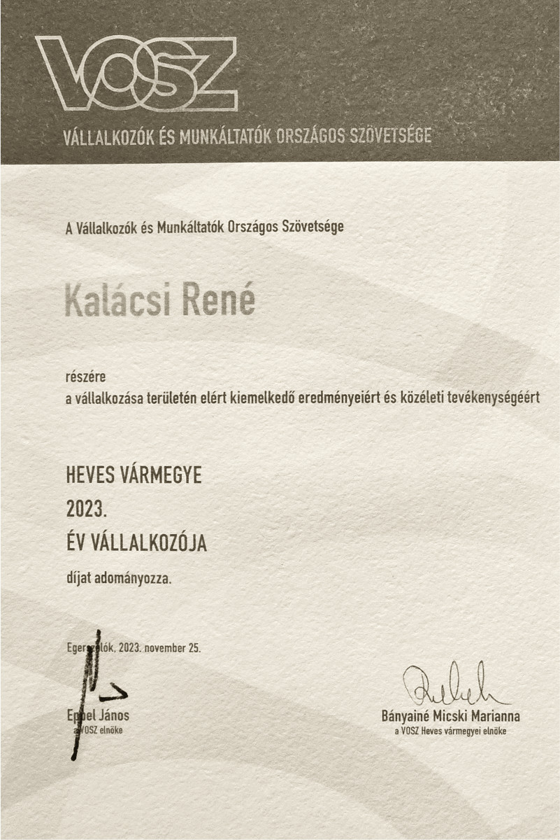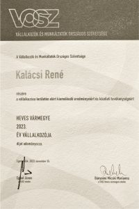 2023-ban a VOSZ Heves Vármegyei „Év vállalkozója” díjat ítélte meg Kalácsi Renének